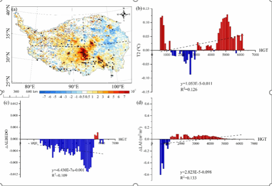 图1 地表属性变化对青藏高原气温的影响(a)空间分布及(b)气温、(c)地表反照率和(d)叶面积指数变化的海拔梯度分析