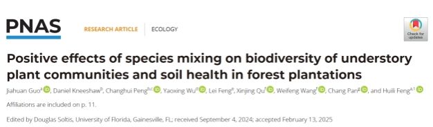 76net必赢官网元素生物地球化学研究团队成员郭佳欢博士以“Positive effects of species mixing on biodiversity of understory plant communities and soil health in forest plantations”为题在《美国科学院院刊》(PNAS)上发表最新研究成果(原文链接:https://doi.org/10.1073/pnas.2418090122),并被选中在PNAS Showcase on Kudos展示。